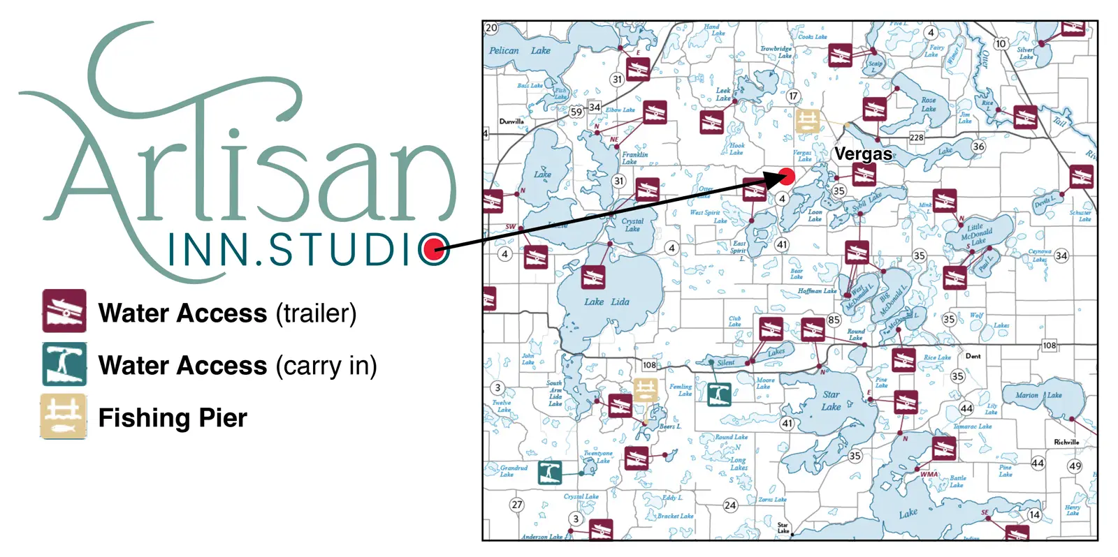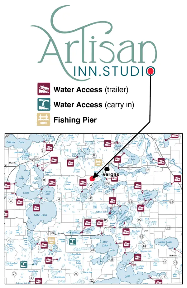 The Artisan Inn Studio offers cozy winter lodging near Vergas, Minnesota, making it the perfect home base for ice fishing in Otter Tail County. Surrounded by some of the area’s most popular fishing lakes, guests enjoy easy access to ice fishing for walleye, northern pike and panfish throughout the winter season.