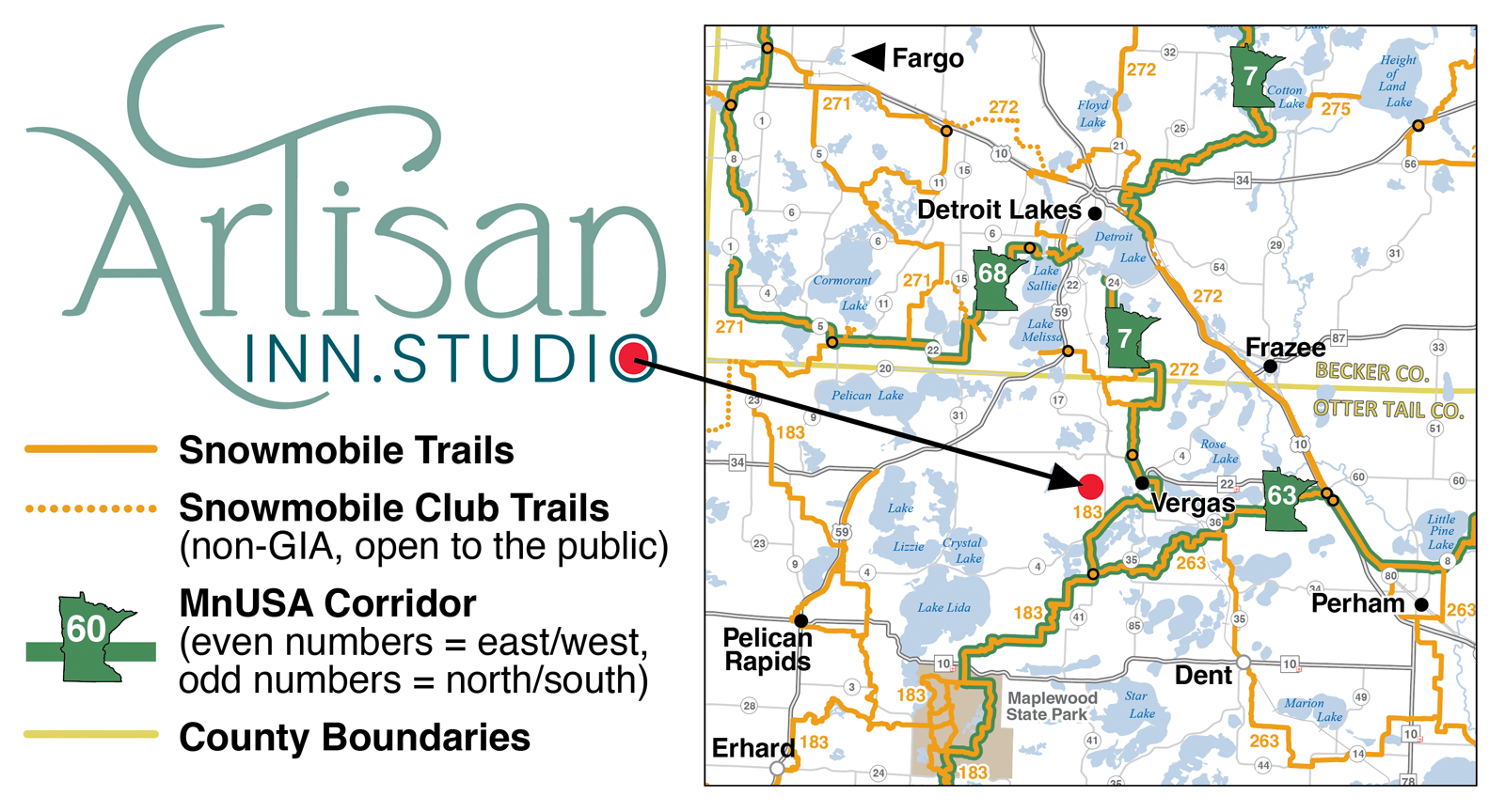 The Artisan Inn Studio offers ideal snowmobile lodging near Vergas, Minnesota, in the heart of Otter Tail County lakes country. Surrounded by groomed trail systems, our retreat and group lodging provides the perfect home base for snowmobile weekends, winter getaways, and riding groups.